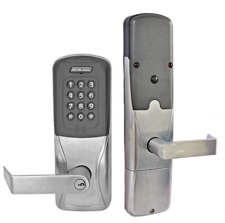 Schlage AD-400 Series is a networked wireless lock that communicate by 900 MHz wireless technology to the PIM400, operating independently of the IT network. AD-400 features upgradeable credential reader modules and real-time integration with most access control systems and is availablie in mortise, cylindrical, mortise deadbolt and exit trim options which featured credential reader and other sensors.