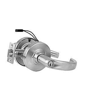 Electrified cylindrical lock with Sparta lever style, full size conventional cylinder, request-to-exit and "C" keyway in Bright Chrome finish.